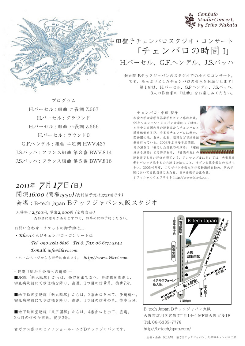 そして、7/17にはB-tech Japan大阪でのスタジオコンサート「チェンバロの時間I」を無事公演することが出来ました。大変暑い中をいらしてくださった皆様、ありがとうございました。